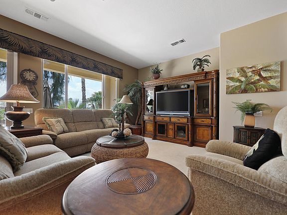 South Facing and on the 17 hole of the Sun City Shadow Hills south course, this 2230 sq. ft. Castellano model is a rare find. Overlooking the lake with endless mountain and golf course views. The hot tub is surrounded by mature Palm Trees to give a cozy private feeling. Custom paint, 2 bedrooms 2 1/4 baths, formal dining area with a long breakfast bar and a kitchen nook give you ample space for entertaining . The kitchen opens to the great room with endless golf course views.