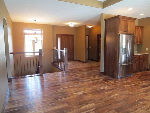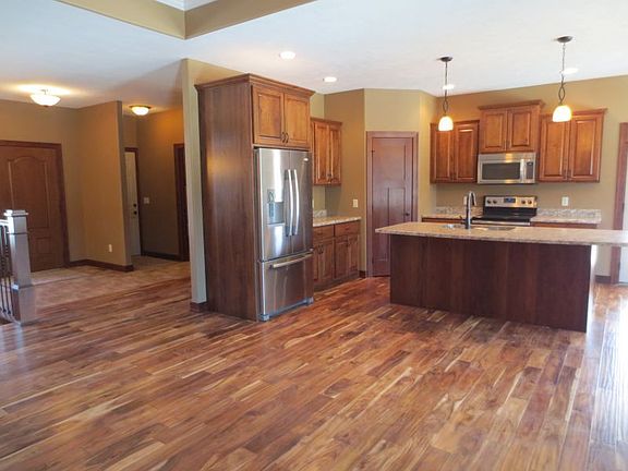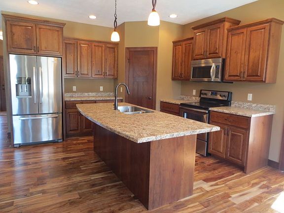 New construction ranch home in desirable Cinnamon Ridge! You will notice the quality right away! 3 beds on the main level! Great master suite w/raised double vanities,walk-in closet & large tiled shower. 2nd bedroom would also make a great office w/vaulted ceiling,circular transom window & double closet.Beautiful kitchen w/rustic cherry cabinets from Sioux Falls Kitchen & Bath,stainless steel appliances,wood floor,high definition laminate countertop w/molded stainless steel sink & convenient pantry.The dining room has wood floors & door w/built-in blinds to covered deck.Wood floor throughout the main & through the living room w/tray ceiling & gas fireplace.There are too many extras in this home to mention them all...4 zone wiring for sound,oil rubbed bronze fixtures & faucets throughout,Windsor casement windows,tile & wood flooring,main floor laundry,3 panel wood doors,framed & fully insulated open lower level w/plumbing for wet bar,finished garage & sod,sprinkler & rock!