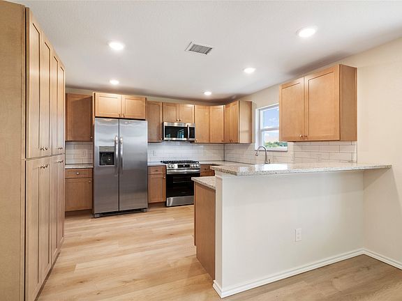 Stainless steel appliancesDining areaGranite countertopsCovered back patioStylish kitchenHuge walk-in closetInside utility room