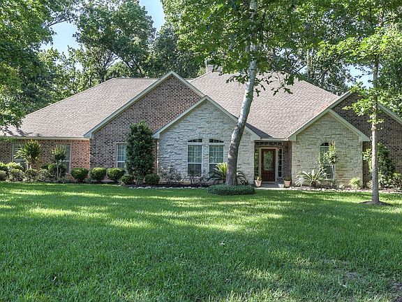 Sprawling 3 bedroom one-story home on beautifully wooded 1.3 acre lot. This custom-built home has a floorplan designed for entertaining and family gatherings! Gorgeous family room with wood flooring and stone fireplace opens to lovely kitchen and dining area, accented by custom wood cabinets, granite counters and large island/breakfast bar. Great split plan offers spacious master bedroom, and media or huge study. Incredible Utility Room/Craft Room! Extra storage inside and garage. No MUD tax!!