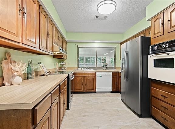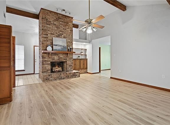 Comes with Generator **NO Carpet** Well maintained four bedroom home has a versatile floorplan with HUGE 400 sq ft room; great for second den/playroom/craft room, etc. Separate dining room could also be a great office. Den has soaring ceilings, gas/wood burning fireplace, built in shelving and wet bar creating a warm and inviting space to relax or entertain. The kitchen is well equipped with range, oven, dishwasher, refrigerator and two pantries. Updated primary bath with EZ access shower. You'll also appreciate the convenience of the indoor laundry with shelving. Oversized garage for extra storage space. New roof & HVAC in last few years; Trane a/c... mostly all double insulated windows. Step outside to the fully fenced backyard with French drains and no back neighbors - just peaceful green space. Nice shed.
