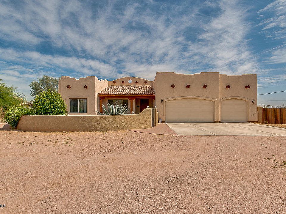 Upgraded Territorial home on 1.25 acre lot w/private domestic water well close to the Goldfield Mtns. Enjoy the morning sunrise from the upper level deck or sunsets from the extended covered rear patio. This 4B/2B home w/front court yard outside the city limits of Apache Junction includes tile flooring, 9''+ ceilings, 2-tone neutral paint, interior stacked stone faced fireplace & built-in entertainment nooks. Upgraded kitchen includes island, granite counter tops, tile back splash, SS appliances, plenty of cabinets & pantry. Large master suite w/wood laminate flooring & separate exit/entrance from back yard. Master bath has huge jetted tub, dual vanities w/granite counter tops, separate tub/shower, & large walk-in closet. Don''t forget the RV gate and RV parking for all your toys!