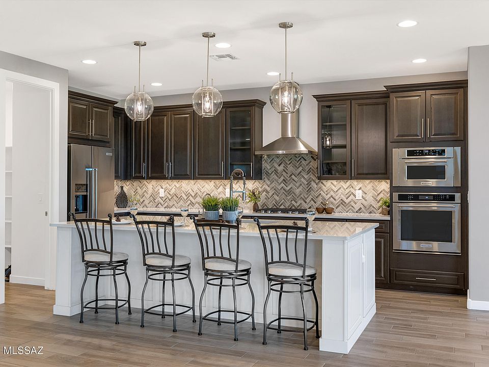 Beautiful View lot in coveted, gated Villages at Silverhawke in Oro Valley. 2020 built Meritage 2342 sqft 3bd/2.5ba Aldea plan with many, many builder + owner upgrades. No expense spared in choosing the finishes and details of this meticulous home. Imagine hosting holiday celebrations in the chef's kitchen with two-tone cabinets, 42'' uppers with crown molding, quartz counters, organizational package (pull-outs!), upgraded KitchenAid appliances including gas cooktop, beautiful backsplash and a huge island overlooking the great room. Adjacent to the great room is a pocket office with full cabinets - perfect for homework or hobby space. Beautiful mountain views from great room and adjacent dining area with sliders to a deep covered porch and fully landscaped north-facing yard with a view fence highlighting the open space behind. Meander the paver pathways in the front yard around to the back where you can enjoy the views of Pusch Ridge from the wood burning firepit or the shade of the porch and trees. Upgraded 16 seer HVAC, neutral wood-look tile floors in the common areas, 8' doors and enhanced can lighting throughout, and convenient up-down shades on the windows! Epoxied 3-car tandem garage with access to back yard.