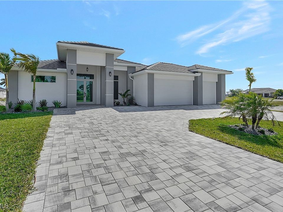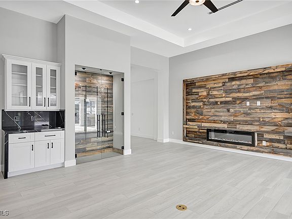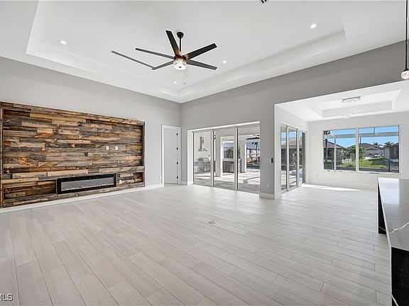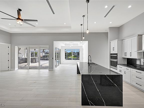 Built in 2024 this nearly new luxury custom waterfront home in NW Cape has it all. As you approach the home you notice the 3 car garage, circular paved driveway, professional landscaping and the modern architecture. As you enter the double glass doors you will notice the custom plank tile floors, volume ceilings with water and pool views through the house. To the right of the entry is a large den with glass doors for privacy. Next is the great room just off the kitchen with a custom TV enclosure and an electric fireplace. Large Sliders are just off the great room out to the lanai area. Next too the great room is the kitchen with a breakfast island, custom granite and cabinets and stainless steel appliances. Also there is a built wine closet for proper storage of your favorite wines / beverages. Just off the kitchen is a large dining area with sliders to the lanai and also an entry to the pool bath. To the rear of the kitchen are two large bedrooms with custom closets, large windows and each of these bedrooms each has it's own full bathroom. Off the kitchen is a large utility room with sink and access to the three car garage. On the other side of the house is the primary bedroom with sliders to the lanai / pool / spa area with large windows. The master bath features two large walk in closets with "California" style closets, two large vanity areas with granite tops and separate sinks with a soaking tub and a walk through shower with glass doors. Once you enter the lanai you will see the fabulous outdoor kitchen area that has a full sink, gas grill, refrigerator / beverage center and a serving / eating bar over looking the large pool and spa. The pool area has custom pavers to match the house and the screen cage features "Picture Window" screening to allow full view of the canal area. The pool area also features an outdoor shower and a pool bath that has access into the house. This area is perfect for entertaining with the large lanai area and the house can be opened up from the primary bedroom, the great room and the dining area for easy access when entertaining. The large 3 car garage has epoxy coated floors and an exit door for access to the yard / canal. The owner spared no expense when building utilizing all impact windows and doors high end upgrades. The home has an eastern rear exposure which allows you to enjoy the morning sun with coffee but allows afternoon shade to enjoy your dinners and relaxing evening pool time and relaxation. This luxury home is affordably priced and in an area of planned growth of the 7 Islands project area with future marinas, restaurants, luxury homes, walking paths, Amphitheaters, venues and more and walking distance to the new Tropicana Park with kayaking, water activities and more. Close to Pine Island Rd with restaurants, shopping and quick access to Cape Coral and Fort Myers. Easy access by water to St James City, Bokeelia, Sanibel and more through the Matlacha Pass.