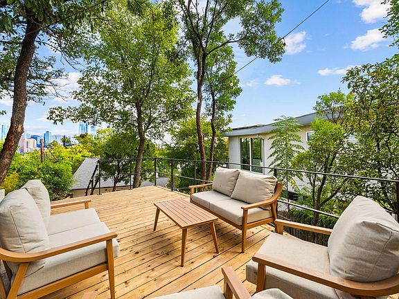 With an unbeatable Travis Heights location, this one-of-a-kind home checks every box for elevated urban living. Perched on a ridge with panoramic Downtown Austin views, this architecturally distinct house offers a stunning multi-level floor plan designed for both comfort and sophistication. Step into the heart of the home: a chef’s dream kitchen outfitted with top-of-the-line appliances, including a Wolf dual 30” range with Pro 600 CFM hood, 36” Sub-Zero built-in refrigerator, Sub-Zero dual zone 24” wine cooler, and a Cove dishwasher. Elegant Quartzite countertops, handcrafted Cle Zellige tile backsplash, and sleek composite, low-maintenance cabinetry elevate the space with timeless style and function. Natural light pours into the living and dining areas, accentuating the home’s soaring ceilings. Multiple terraced decks create the perfect setting for entertaining, relaxing, or taking in the breathtaking Austin skyline.The spacious owner’s suite feels like a private retreat, complete with a personal balcony, an oversized tub, glass-enclosed shower, and generous walk-in closet. Enjoy cool evenings inside by the cozy fireplace or host unforgettable gatherings across the multi-tiered outdoor living space. 811 Rutherford Pl is ideally located just minutes from South Congress, Lady Bird Lake, and downtown Austin with walkable access to Austin’s best dining, shopping, entertainment, and outdoor recreation. This rare Travis Heights gem offers the ultimate in style, location, and lifestyle.