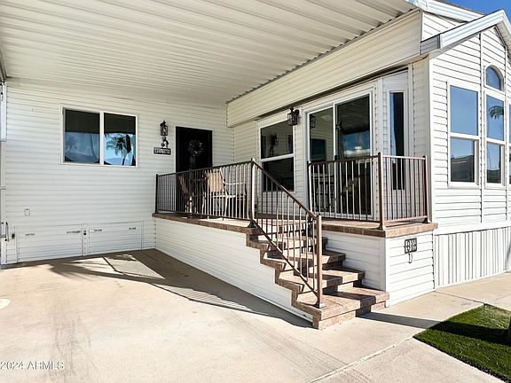 THIS ELEGANT HOME sits PERFECTLY SITUATED just a short walk to the RESORT CLUBHOUSE. SOUTH FACING & FABULOUS CURB APPEAL. LOCATION at it's FINEST! THIS DESERT RETREAT is SPECTACULAR! GREAT carport space w/ privacy screen & wait until you see the FABULOUS OUTDOOR TILED DECK! You will LOVE sitting outside taking the GORGEOUS AZ weather in! PERFECT for your morning coffee, reading a book or whatever you desire! LUXURIOUS & UPGRADED this 1 bed, 1.75 bathroom home is RICHLY APPOINTED w/ A LARGE AZ ROOM perfect for gatherings, bright & IDEAL for all your guests to come visit! FABULOUS AZ bathroom is ROOMY & SPACIOUS offering a grand WALK IN SHOWER, NICE VANITY SPACE & A GREAT DESIGN, COMPLETE w/ a SEPARATE LAUNDRY ROOM W/ FULL SIZE WASHER,DRYER, LOTS OF STORAGE CABINETS & A DOOR to the back patio for easy access! The POPULAR U-SHAPED kitchen is truly a chef's delight! Enjoy an ABUNDANCE of upgraded cabinetry for all your storage needs, featuring a FULL SIZE STOVE, microwave & PLENTY of counter space-perfect for all your cooking & entertaining! The BRIGHT front living room is filled with natural light from the large windows, creating a warm and welcoming atmosphere & boasting a slider door for your outdoor deck access! You'll love the DUAL PANE WINDOWS throughtout for energy efficiency & comfort, along with BEAUTIFUL flooring that flows seamlessly through the home! The main bathroom offers a roomy WALK IN SHOWER & ample cabinet space. The GRAND bedroom is spacious & comfortable-ideal for a great nights rest-and INCLUDES a BUILT IN MIRRORED CLOSET w/ drawers plus a BUILT IN DESK, perfect for hobbies or a home office setup! You'll also appreciate the additional mirrored closet in the hallway for extra storage! This home is TASTEFULLY FURNISHED and COMPLETELY MOVE IN READY, so all that's left to do is unpack & enjoy. As an ADDED BONUS, it features A NEW ROOF w/ transferrable warranty (on park model in 2024- AZ room roof was recoated) giving you peace of mind for years to come! OWN THE LAND, OWN THE FUN IN this highly sought after 55+ Resort! This is a MUST SEE GEM! COME LIVE THE LIFESYLE YOU DESERVE!