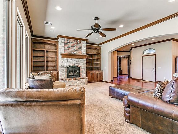 Custom built home on 2.18 acres. Tuttle Schools. 3 bed, 3 1/2 bath, study, formal dining, 2 living OR 2nd living could be used as 4th bedroom. 3 car OVERSIZED garage attached to home, and 4th car garage is brick shop attached to home by portico. Portico can also be used as additional covered parking. No HOA!! Home is located outside city limits! Primary bedroom has walk in shower, separate tub, huge walk in closet. Kitchen has large island with farm sink, built in hutch, large pantry, appliance garage and above/under cabinet lighting. Living room has wood burning fireplace with built in bookcases. List of amenities include: generator plug & hookup, plantation shutters and custom mini blinds, fenced back yard, water softener, OEC fiber internet, over sized bedrooms, soffit lighting (controlled by timer) soffit plugs & walk out attic from bonus room for extra storage. Hurry and you can enjoy fall on this large covered patio.