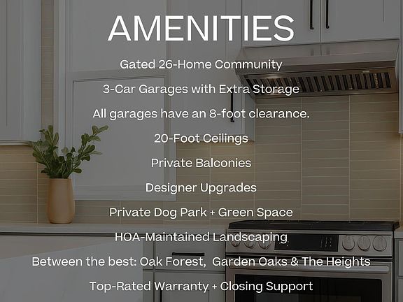 Experience life at Thornton Oaks, a gated community ideally located between Oak Forest, Garden Oaks, and The Heights. This thoughtfully designed floor plan offers 3 bedrooms, including a convenient first-floor guest suite. Enjoy a light-filled open layout on the second floor featuring a stylish kitchen with an oversized island and beautiful cabinetry, perfect for entertaining or relaxing at home and a private balcony. On the third floor is the luxurious primary suite with a spa-inspired bath and a large walk-in closet for ultimate comfort. An additional secondary bedroom completes this space. With a spacious 3-car garage, a private dog park, and flexible living spaces, these homes blend function and style seamlessly. Located near Houston’s best dining, shopping, and major freeways, Thornton Oaks delivers modern living in an unbeatable location.