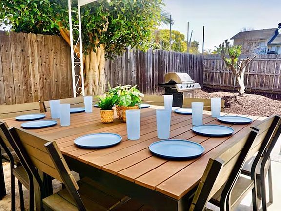 This 4-bedroom, 2-bathroom home is fully furnished and ideal for midterm rental. The property comfortably accommodates up to ten people, with four queen bedrooms and a queen air mattress in the living room. The spacious open living area features a sectional sofa and a 65" Smart TV with streaming access to Netflix, Hulu, Disney+, and Amazon Prime. The fully equipped kitchen includes modern appliances, ample cookware, and a dining area for six, while the private, fenced backyard provides a BBQ grill, fire pit, sectional sofa, and 10-person patio table. Beach gear including chairs, boogie boards, and bikes are provided for easy access to nearby Oceanside Beach, just a five-minute drive away. Three parking spaces are available, including two driveway spots and one garage space.