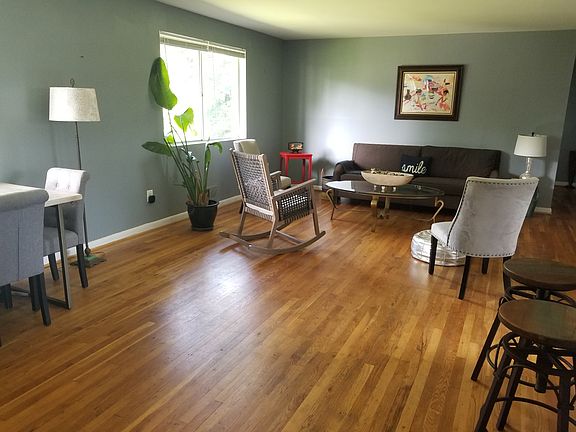 Brick mid-century houseFront double door entranceOutside patio setBeautiful hardwood floorsSpacious fully-fenced yardFree street parkingPrivate floor of house