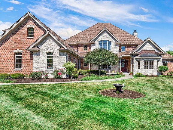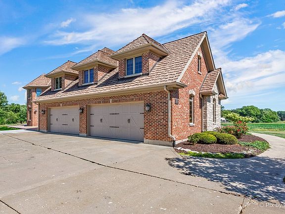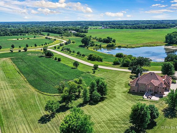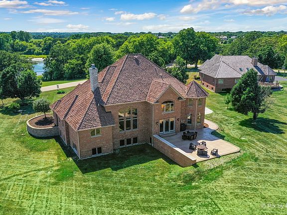 Welcome to luxury living at its finest! This stunning all brick and stone two-story estate sits on nearly 2 acres of beautifully landscaped grounds, offering serene pond views and a lifestyle of elegance and comfort. This property provides endless possibilities with a second buildable lot that already has a well in place and utilities at the edge, ready to build another home! The floor plan has been designed for both daily living and entertaining, this home has 5 bedrooms, 5.5 baths, and endless space for family and guests. As you enter, a grand 25' foyer welcomes you with a dramatic curved staircase, soaring 25' ceilings, and a breathtaking 2-story fireplace framed by built-ins and a wall of windows. Custom millwork, trayed ceilings, and high-end finishes throughout exemplify the home's quality craftsmanship. The gourmet kitchen is an entertainer's dream, featuring custom cabinetry, a full-size refrigerator and freezer, high-end appliances, and a massive granite island with a prep sink. Dual ovens, a 5-burner range, and a dual-drawer dishwasher make cooking a breeze, while the hearth and breakfast rooms, separated by a cozy see-through fireplace, provide the perfect setting for casual meals. The main level primary suite is a private oasis, complete with a personal fireplace, dual closets, and a spa-like bath featuring dual sinks and a shower with body jets. Additional highlights of the main level include a formal dining room, a mudroom with built-in cubbies, a home office, and a laundry room. Upstairs, find three en-suite bedrooms and a spacious bonus room that can serve as an additional bedroom. The finished 3,000 sq. ft. basement offers endless possibilities with a 5th bedroom, full bath, recreation room, and living room separated by a shared fireplace. With its private entrance from the garage, this lower level is perfect for an in-law arrangement and even has plumbing ready for a future kitchen. Outside, enjoy the expansive patio and peaceful country views, or take in the water views from your porch. A 4-car garage offers ample space for cars and toys, and the home comes with an additional buildable parcel. Nestled in the hidden gem of Spring Grove, this property offers award-winning schools, scenic views, and easy access to O'Hare and Milwaukee airports, Lake Geneva, the Chain O'Lakes, and more. Plus, Sundial Farms offers horse boarding and direct access to nearby state park horse trails. This one-of-a-kind home truly checks all the boxes. Welcome to your new home!