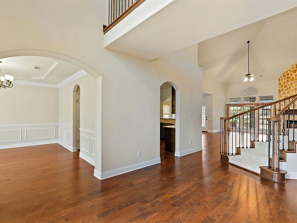 Stunning 6-bedroom Gallery Custom home on an elevated lot in Sachse's Woodbridge community. Features include a gourmet island kitchen, soaring ceilings, floor-to-ceiling stone fireplace, and elegant iron stair rails. Primary suite plus guest room on main floor; upstairs offers a theater room, 4 bedrooms with walk-in closets, and 2 baths. Enjoy a 3-car garage, covered patio with gas line, lush landscaping, and easy access to greenbelt trails and the nearby elementary school. 1 year or 1 year plus