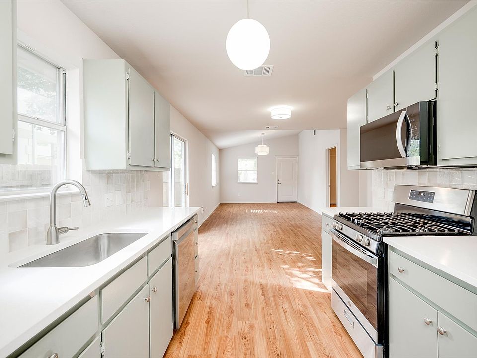 New appliancesHigh ceilingsVinyl plank flooringOpen kitchenFresh cabinetsWarm tile backsplashPrivate fenced-in backyard