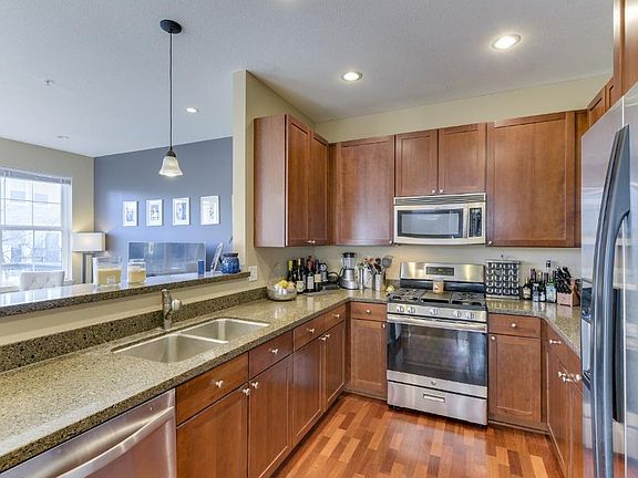 New Price, New Paint & Carpet! Thoughtfully designed corner unit w/Luxury 18x16 Master Suite. Open style main floor w/hardwood throughout & den w/fireplace. Perfect for entertaining w/oversized WO deck & covered porch. Ceramic tile, granite, hardwood flrs, stainless appls. Possible 3rd Bed on main floor. Located in the heart of downtown Maple Grove Arbor Lakes within walking distance to over 40 shops & restaurants/Central Park.