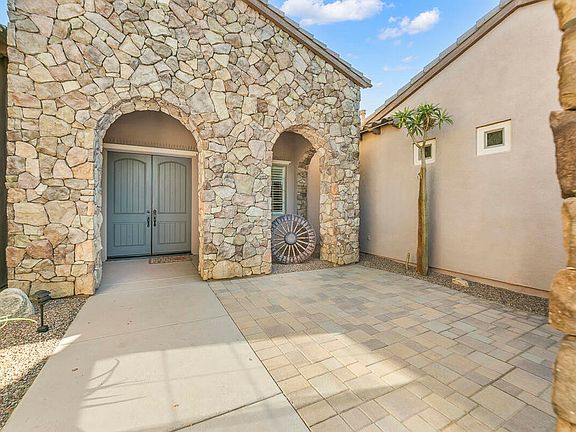 Tuscan-inspired resort home in Montage Santa Rosa, an STR-friendly gated community just minutes from world-class events. A gated courtyard opens to a grand foyer with soaring vaulted ceilings and statement chandeliers. The 4BD/3.5BA layout (plus den/office) balances elegance and function: formal dining with butler's pantry, and a chef's kitchen with double ovens, granite counters, walk-in pantry, and a generous breakfast nook flowing to a light-filled family room with 9' ceilings. Quality finishes include appliances/fixtures from Pacific Sales and tile/quartz selections from Arizona Tile. The south-facing backyard is an entertainer's dream with saltwater PebbleTec pool/spa and a large covered patio. Retreat-style primary suite offers two oversized walk-in closets, soaking tub, and walk-in shower. Major upgrades: dual Rheem 5-ton 16 SEER ACs & furnaces (2022), water heater (2024), pool heater/pump/control system (2017). Three-car garage with potential to convert one bay to an attached casita for added flexibility and income potential (buyer to verify). A compelling option for full-time living, a vacation retreat, or a high-performing STR.