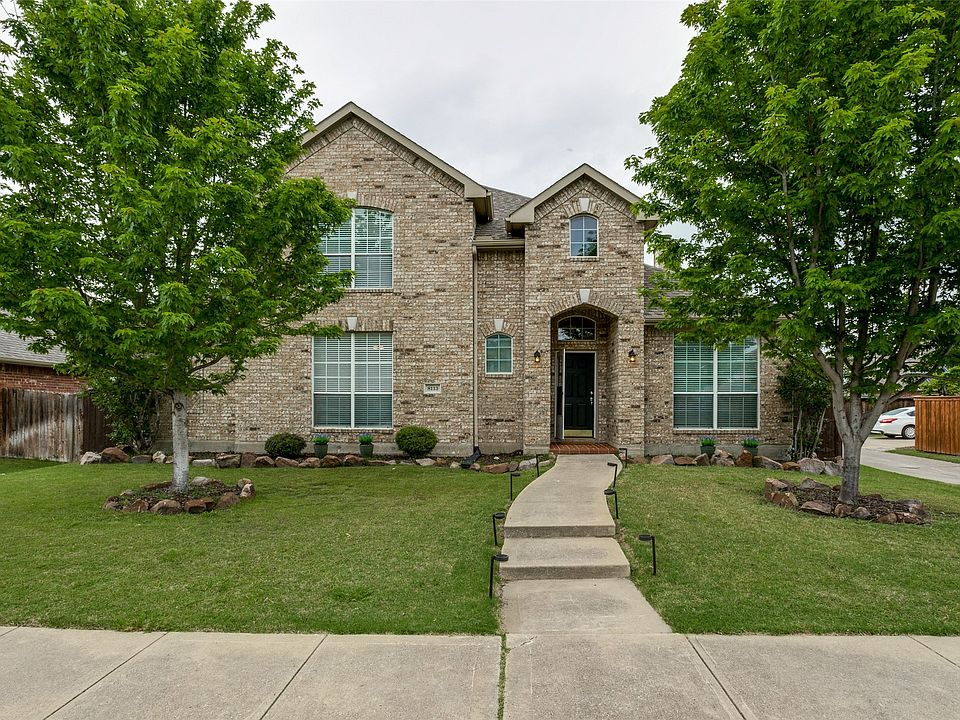 Step into Spring in this beautiful 2 Story Home in Lakewood Pointe in Rowlett ~ 2 Community Pools! ~ 4 Bdrms, Primary on first level, 3 other SPACIOUS bedrooms and full bath upstairs! Versatile floorplan! Lovely home w numerous updates-Dec-2022 including quartz countertops in kitchen, bathrooms, interior painting, carpet, gas range! Hot water heater replaced 2022, Roof 2016. Foyer opens to high ceilings, stacked formal living and dining rooms. Beautiful eng wd flooring downstairs. Large family room w gas fireplace, mantel and lots of windows for wonderful light! Delightful kitchen provides painted cabinets, island, breakfast bar, quartz countertops w gorgeous backsplash, built-in desk area and gas range. Cheerful breakfast area w window seat, view of bkyd! Primary bedroom boasts en-suite bath w separate tub, shower, WIC, separate vanities. Iron balusters on stairs. Powder Rm and Utility Rm down. Stone-lined flower beds. Whole House Surge Protection! Cov'd Porch and Patio!