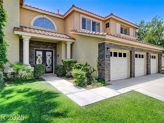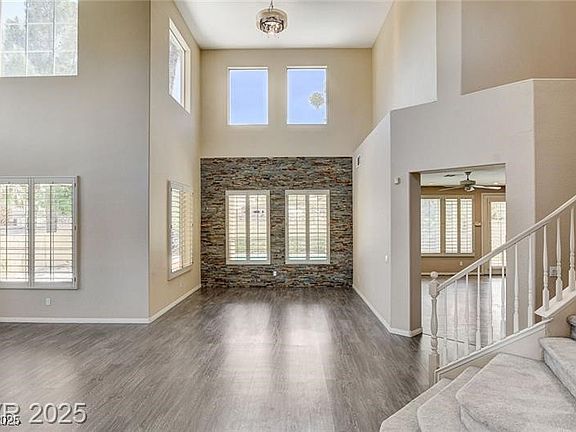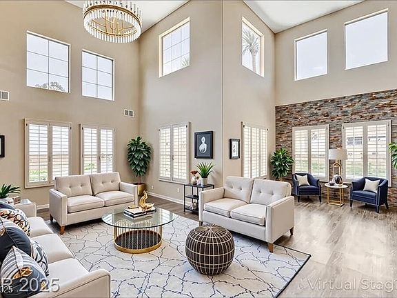 Welcome to this exceptional 2-story estate, ideally situated in a prestigious gated community near Summerlin.! A dramatic 20-foot ceiling great room and an abundance of natural sunlight create a breathtaking first impression the moment you step inside.Thoughtfully designed with 4 bedrooms—all with private en-suite baths—including a spacious downstairs guest suite and a dedicated office. The upstairs primary retreat features a private balcony, spa-style bathroom, makeup vanity, and a custom walk-in closet. Soaring ceilings highlight the bright, open layout. The spacious family room with fireplace flows into a chef’s dream kitchen with a massive island, walk-in pantry, and custom cabinetry. Enjoy a 3-car garage and step into your own resort-style backyard with a sparkling pool, spa, and beautifully landscaped grounds. Don’t miss the opportunity to make this luxurious, move-in-ready home your own—schedule your private showing today!