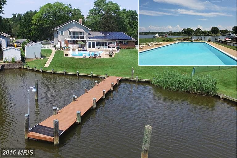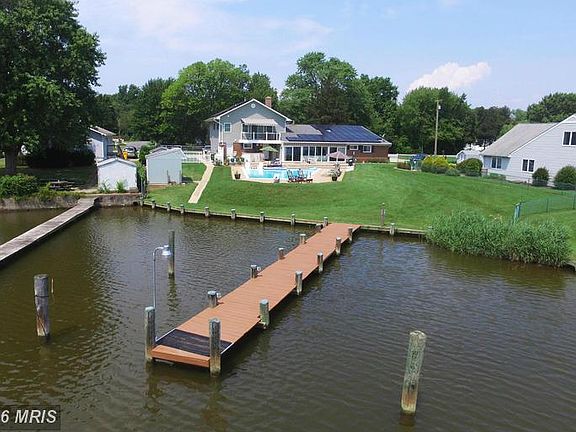RESORT SETTING: RECENTLY REMODELED HOME with waterside POOL also has PRIVATE PIER just minutes to the Ches Bay; WOW master suite addition upstairs w/ huge office, spa-like bathroom, wood floors, & waterside balcony; gorgeous cherry kitchen w/ granite; all upgraded bathrooms; wood floors & wall of windows facing the water. Solar panels mean electricity is basically FREE! Main level MBR option too.