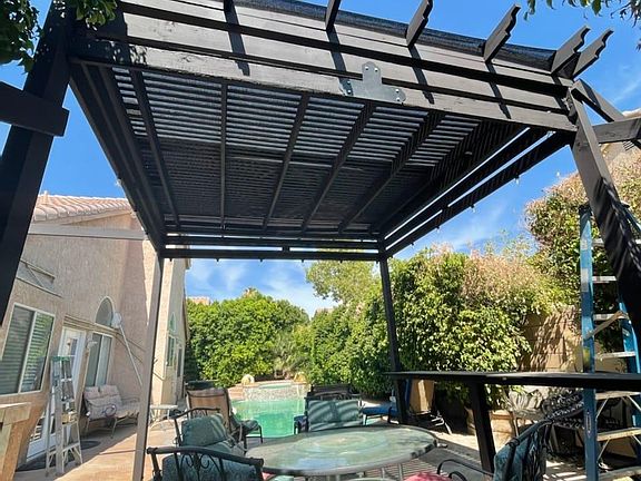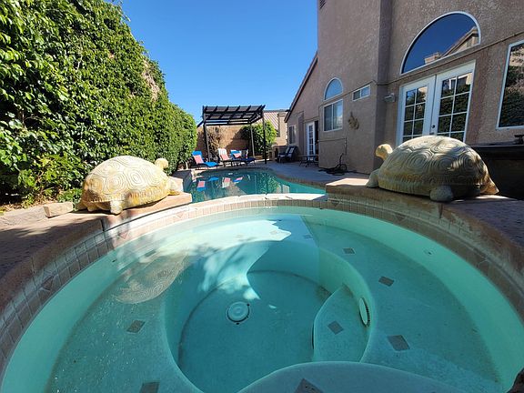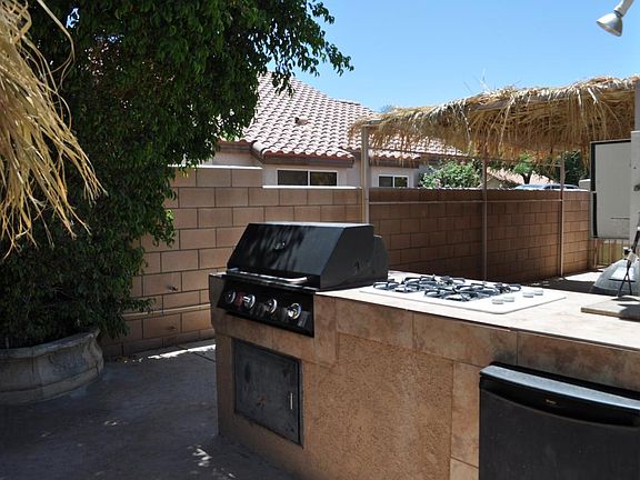 Enjoy a beautiful & spacious vacation home with your own private sparkling salt water pool and spa, shady gazebo with exotic fountains and mists, covered RVparking. Single level open floor plan.Great for entertaining! Built-in outdoor BBQ with undercounter refrigerator, plenty of patio furniture. The home living spaces are open with cathedral ceilings, celestial windows, tile floor, granit counters, french doors leading to pool and outdoor dining/entertaining areas. In the great room watch a big screen TV, or pick a book and relax by the fireplace. Dining room invites you to a new glass table with 6 leather chairs. Kitchen is fully equipped & ready for your culinary creations. In the master bedroom you'll find a king size bed, lg window and french door to the pool. The master bathroom has a soaking tub, separate shower, walk in closet & double sinks. Rooms include bdrm 2(queen), bdrm 3(queen), bdrm 4(sofa sleeper). Laundry in garage. Minutes to famous Marriott, El Paseo & golf courses.