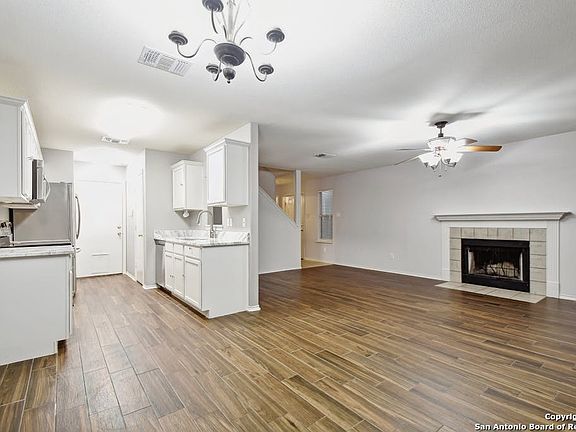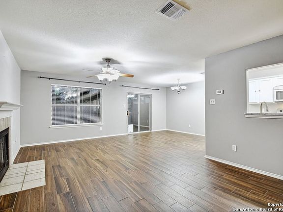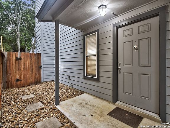 Beautifully updated townhome nestled in the quaint gated community of The Village at Rustic Oaks. Featuring marble counters in the kitchen and bathrooms, two bedrooms with en-suite facilities, stainless steel appliances, wood-burning fireplace, covered patio, oversized walk-in closets and pantry! The third bedroom downstairs can be used as a study/office or personal gym. Easy access to UTSA, USAA, the Medical Center, and all your essential needs.