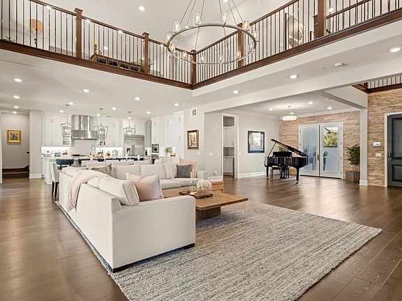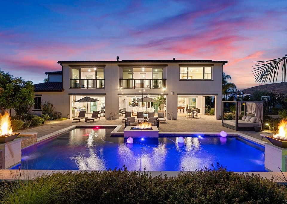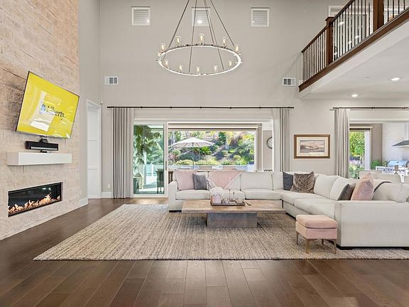 Welcome to modern elegance in The Lakes Above Rancho Santa Fe. Set on a landscaped acre, this striking Sterling Heights Plan 3 home blends luxury, privacy, and the Southern California lifestyle. Behind the gates of this prestigious enclave, discover a five bedroom, five and a half bath residence offering 5,665 square feet of refined living space. Clean architectural lines, 22-foot ceilings, and expansive glass walls fill every room with natural light and sophistication. Designed for effortless living and entertaining, the main level features a chef’s kitchen with premium finishes, a formal dining area, and an open great room flowing seamlessly outdoors through retractable glass doors to stunning covered outdoor California room with retractable shades for ample comfort at all times. A spacious guest suite and versatile bonus room—ideal for an office, gym, or playroom—complete the first floor. Upstairs, the primary suite is a serene retreat with a spa-inspired bath, dual vanities, soaking tub, walk-in shower, and custom dressing room. Three additional ensuite bedrooms with walk in closets and a loft lounge complete the second level. The 1.29 acre lot offers a backyard that is truly an entertainer’s dream with a sleek pool and spa, outdoor kitchen, sports court, and space for a garden or grassy play area. Also included are lime, lemon, orange, pomegranate, and fig trees along with other raised planter beds. Additional highlights include solar, whole-home water filtration, and a four-car garage. Optional membership at The Crosby Club includes access to golf, tennis, dining, and fitness amenities. Located within the award-winning Poway Unified School District and just minutes from hiking, dining, golf, and coastal access—this is luxury living at its finest.