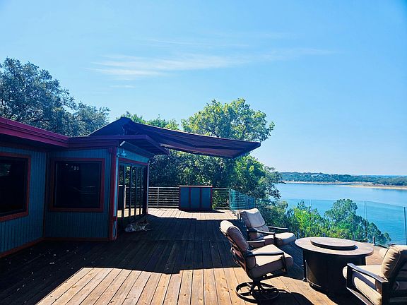 Stunning 2-bedroom, 2-bath waterfront compound with guest house offering turnkey, resort-style secluded living with oversized driveway space, and exceptional year round deep water access. Meticulously upgraded throughout the last decade, the Main House was fully remodeled (2014) with new kitchen appliances, comprehensive plumbing upgrades, new bathrooms, and major systems improvements including a 2018 central A/C (over-sized condenser, air handler, ducts). Experience seamless indoor/outdoor living with a dramatic 15' La Cantina window wall, a top-of-the-line automatic back-patio awning with drop shade (2017), and energy-efficient double-pane Low-E, sound-dampening windows throughout (2022) with remote/app-controlled blinds and tint. Exterior refreshed 2025. Outdoor amenities are extraordinary: a three-story deck addition (2023) totaling 2,550 sq ft (1,000 sq ft lower, 1,300 sq ft main, 250 sq ft upper) — each level delivers panoramic water views and breathtaking, unobstructed sunsets that make evening entertaining unforgettable. Additional highlights include an 800 sq ft lower concrete pavilion with perimeter bench seating (2022), MasterSpa Michael Phelps 19' trainer swim spa, electric 7 person trolley to a waters-edge concrete patio at the mid-stair landing, and new 4'-extra wide galvanized steel stairs (100' run) with removable handrails and a C-channel for precise dock gangplank alignment (2022). Secure and private with 6' wood side fences, elegant stone front wall and 30' automatic gate (2023). Guest House (650SQFT) fully remodeled to studs (2014) and fitted with a new metal roof (2023). Waterfront infrastructure is best-in-class: dock remodeled in 2021 to ~2,500 sq ft (1,600 lower / 900 upper + storage), powered dual jetski lifts (2017) with four remotes, and an 18,000-lb HydroHoist three pontoons lift (two motors, remote). A rare, turnkey estate that blends large-scale outdoor living, premium comfort systems, and endless evening sunsets.