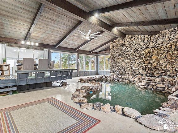 Spectacular White Lake Township home! This stunning ranch offers over 5,000 sq ft of living space plus a walk-out, partially finished basement, all situated on a beautifully landscaped, fenced-in lot just under an acre. Backing up to 297 feet of frontage on White Lake Golf Course, this property provides a peaceful and private setting with mature trees and exceptional views. Inside, you'll find 4 spacious bedrooms and 4 baths, including a 26x15 primary ensuite with vaulted ceilings, a luxurious bath, and an 11x8 walk-in closet. Bedroom #3 also features its own private bath. The updated kitchen boasts reverse osmosis water filtration, a walk-in pantry and all appliances. Additional updates include a new roof, entire new septic system, updated furnaces and central air units, Wallside windows, recessed lighting and an updated pressure tank for the well. The 24ft family room in the basement, includes a cozy woodstove and walks out to a private patio, perfect for relaxing or entertaining. This home also features multiple patios and a deck, a retractable awning, and tons of luxury vinyl plank flooring throughout. The show-stopping 40x32 indoor pool room includes a gunite inground pool with custom stonework, sauna, a sunken 10-person wet bar, a raised dining/gathering area, and a full bath for changing and showering, complete with a custom dehumidifier system. A 14x11 three-season room adds even more space to enjoy the serene setting. Car enthusiasts will love the 4-car drive-through garage (40x27) and two driveways, providing plenty of parking and convenience. Custom stone landscaping enhances the home’s curb appeal. Contingent on seller finding home of choice (no problem). Buyer and buyer’s agent to verify all information. Minimum 2-hour notice required for showings. No sign on property.