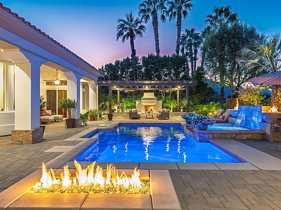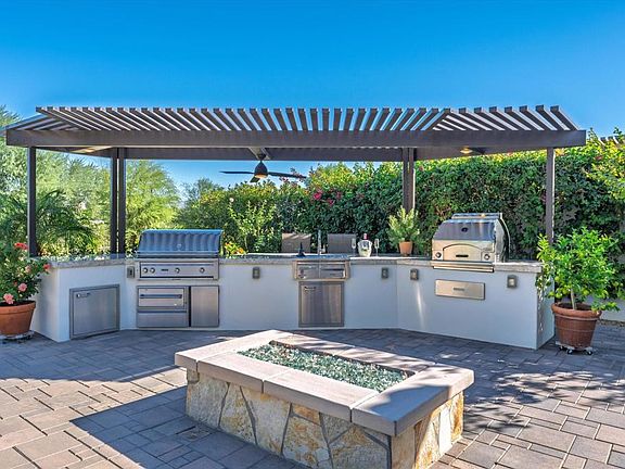An entertainer's paradise, this exquisite residence showcases a recently completed indoor/outdoor transformation. Located on the 2nd fairway of the Greg Norman Course at PGA West, this popular four-bedroom Ventana plan is renowned for its open-concept design, which seamlessly connects indoor and outdoor living spaces. The resort-style backyard features a louvered pergola-covered kitchen island with a Lynx BBQ, Lynx pizza oven, cocktail/wine station, a warmer drawer, and plenty of storage. Enjoy evenings by the large freestanding fireplace under the louvered pergola, or sit by the separate fire pit. Unwind in the pool and spa framed by cascading waterfalls and dramatic fire pots. Lush, professionally designed landscaping surrounds the property, with a wrought-iron fenced yard offering both privacy and a view of the beautiful Santa Rosa Mountains. Inside, a just-completed kitchen remodel shines with an oversized quartzite island, newly added cabinets, matching quartzite counters, and backsplash. Special features include subzero refrigerator, a Miele dishwasher, a Viking Professional cooktop and oven, a warming drawer, a new sink and faucet, and a built-in wine cabinet. The laundry room has just been remodeled to create more space and convenience, including new quartzite counters, newly added cabinetry, a new washer and dryer, a new sink, and a faucet. The primary suite offers spa-like luxury, and a detached casita provides guest privacy. Newly furnished main living areas, kitchen, bar, and family room with exquisite Restoration Hardware furnishings and Restoration Hardware chandeliers and wall sconces. From the beautifully appointed interiors to the resort-inspired backyard, this residence offers a lifestyle to be celebrated, not just lived.