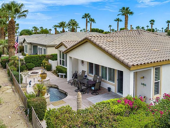 Perched on an elevated 7,841 sq. ft. lot overlooking the 9th fairway at The Golf Club at La Quinta, this highly sought-after Monterey plan with Tuscan facade captures sweeping mountain, golf, and spa views. Offering 1,993 sq. ft. of open concept living, the residence showcases 3 bedrooms, 3 bathrooms, a flexible den/study (or 4th bedroom), and a great room with plantation shutters, a TV/media niche, and wall-to-wall vistas. The chef's kitchen is a showpiece with slab granite counters, stainless steel appliances, built-in double ovens, gas cooktop, prep island with bar seating, tile backsplash, generous cabinetry, and pantry. A detached casita with its own mini-split A/C, kitchenette, en suite bath, and custom tiled shower offers private guest accommodations. The primary retreat features upgraded Berber carpet, a spa-like bath with dual sinks, travertine counters, vanity, and walk-in closet. Outdoors, the rear yard is a true sanctuary with a pebble-tec spa featuring tri-descents and bench seating, plus a fire pit for magical desert evenings--all just steps from the Santa Rosa Clubhouse and resort amenities.