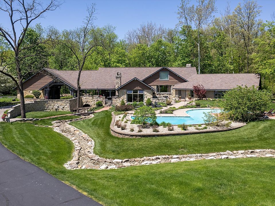 As you arrive, fall in love w/the fabulous view. Gorgeous double doors lead to soaring entry, spacious great room w/ 1 of 2 stone fireplaces, & private deck. Fabulous retreat style home offers a private bedroom wing to relax. Primary bedroom w/2 separate full baths & WIC. Enjoy your cup of coffee in attached breakfast area open to kitchen & sunroom. Dramatic dining room opens to Trex deck that offers entertaining options & views. The outside is just as fabulous w/11.53 wooded acres, custom salt water pool, 60x70 finished pole barn that includes rec. room, bar, 1.5 baths, & loft. All garages are finished w/heat & water. Landscaped yard includes a brook w/bridge, fire pit area & multiple outdoor seating areas to enjoy the beautiful setting.