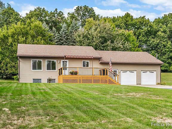 Here's your opportunity to own a meticulously maintained 3 bed, 2 bath home sitting on 2.25 acres in the Caledonia School District! You are warmly welcomed by the front deck with awning that overlooks the manicured yard. Enter in to to an open floor plan; a neutral canvas for your own touches - a generous sized living area, dining, and kitchen with garden window. The main floor holds two large bedrooms, one with dual closets; and a custom updated bathroom! New vanity, vinyl flooring, custom acrylic shower & door! The lower level has an additional living space; a third bedroom and full bath w/ tub! Private laundry room with utility sink; ample storage and newer water filtration system. The impressive attached garage has TONS of storage, and is HEATED! Has very nice mudroom area, and service entry off front and out to the back. Private setting with lots of wildlife! Schedule your private showing today! Premium insulated siding & windows; 2018 decks added; 2018 Hot Water Heater Replaced.