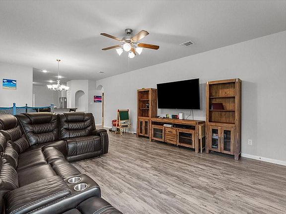EXCELLENT HOME! HUGE OVERSIZED LOT (14,800 sf) in a cul-de-sac with covered patio and NO BACK NEIGHBORS. Plenty of room for a pool and entertainment. This is the one you've waited for! 3 bedroom, 2 bath with additional study. Luxury vinyl plank flooring throughout. New AC installed November 2024. Living room is open to kitchen. Split plan with primary bedroom in the back of the house with en suite bath including double sinks, separate shower and garden tub. The secondary bath also has double sinks. 2-car garage with opener. The subdivision is loaded with amenities including golf course, fitness center, pool / splash pad, playground, walking trails, tennis/pickleball courts. Priced to sell!
