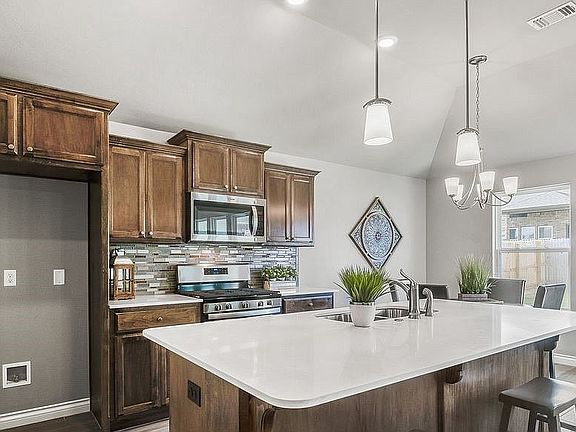 Beautiful home for sale located near Norman North High School. Built in 2019, the home includes a 3 bedroom and 2 bath open concept, with tile wood floors in the main living areas. Kitchen features stainless steel appliances with gas range, tile back splash, and quartz counter tops. Covered back patio with ceiling fan outside. Neighborhood features splash pads, walking trails, ponds, and parks that are all within walking distance of the home. Light fixtures and ceiling fans have been upgraded. There is also a transferable warranty with the home! The home is energy efficient, guaranteeing you low heating and cooling costs all year long. Schedule your private tour today!
