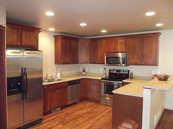 Spacious, custom built 3 bed, 3 bath zero lot home w/walkout lower level that backs to open space. Open floor plan w/laminate wood flooring in dining room & kitchen, cherry cabinetry, breakfast bar, SS front appliances & recessed lighting. Large living room w/trey ceiling, lots of windows & door to wrap around deck overlooking private back yard. Custom tile flooring in entry plus tile flooring in all bathrooms. Spacious master w/extra large walk-in closet, door to deck & private bath w/double sink vanity.