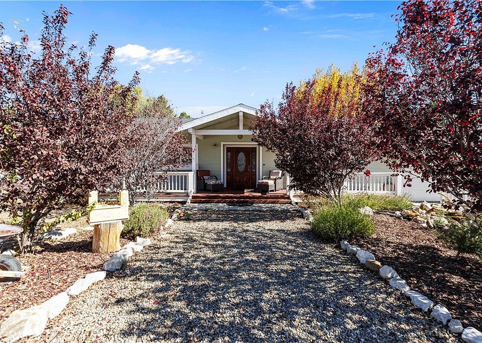 Nestled in Piñon Pines Estates, part of the Frazier Mountain community, this single story charmer greets you first with classic curb appeal from a white picket fence and a tranquil pond with a waterfall. Fully paid off solar keeps energy costs in check. Upon entering, soaring cathedral ceilings with elegant exposed beams set a warm and elevated tone. The kitchen features gleaming granite countertops, soft close cherrywood cabinetry, and solid bamboo floors that continue into a large dining room made for gatherings. The living room centers on a wood burning fireplace beneath extra tall ceilings and custom distressed wood beams for a luxe lodge meets resort vibe. The private primary suite offers an oversized bedroom, a spacious walk in closet, and a spa like bath with a custom travertine shower and a separate jetted tub. Two additional guest rooms are generously sized and served by a large guest bathroom with dual sinks. Outdoors, enjoy all four seasons with a large front porch and a substantial covered entry, plus an expansive wraparound redwood deck at the rear and a fully fenced backyard for effortless entertaining. Practical upgrades include a tankless water heater. A two car garage delivers abundant storage for gear and weekend toys. Set on a quiet cul de sac and just 45 minutes to Santa Clarita, this home feels like a getaway every day.