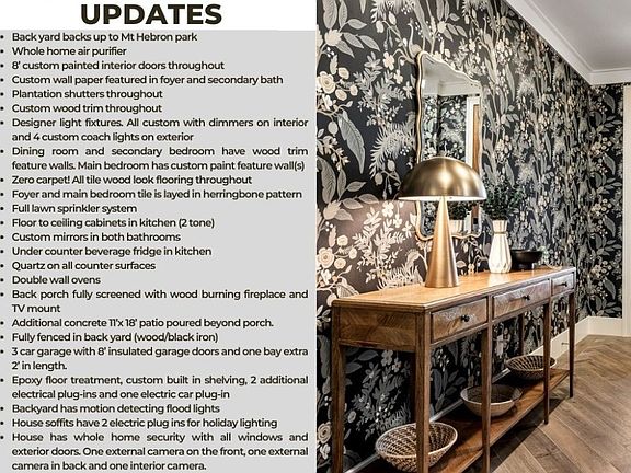 This stunning custom home in the desirable Allen's Mill neighborhood boasts an open floorplan with an abundance of upgrades throughout. From the elegant fixtures to the custom finishes, every detail has been meticulously crafted. The home offers a seamless blend of style and functionality, perfect for modern living. Additionally, it backs up to the scenic Mt Hebron Park, providing easy access to outdoor recreation.
