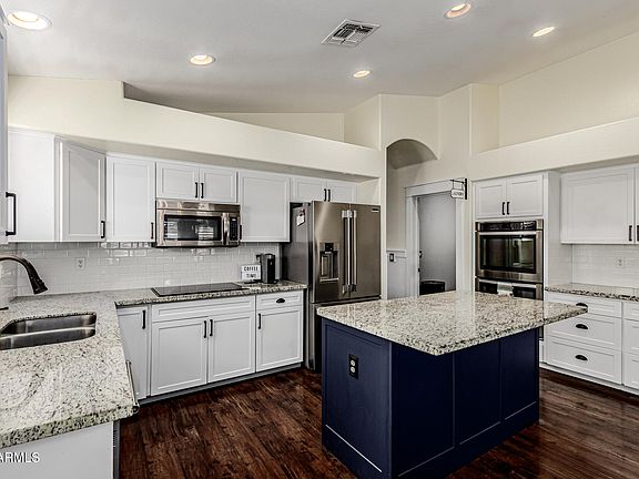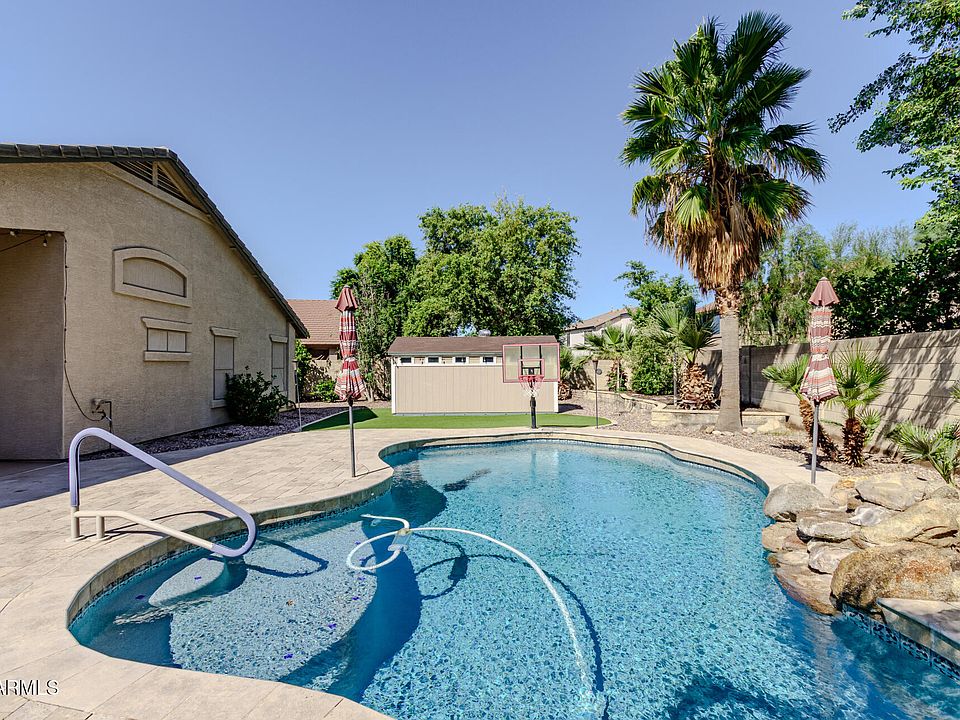 This spacious 4 bed, 2 bath home in the heart of Circle Cross Ranch offers over 2,100 square feet of thoughtfully designed living space. As you enter, you'll appreciate the natural flow, from the open family room at the front of the home to the inviting living area and kitchen, perfect for gatherings and everyday living. The updated kitchen features granite countertops, clean subway tile backsplash, sleek stainless-steel appliances including double ovens, and a roomy pantry. The island provides a convenient space for meal prep, while the dining area just off the kitchen is ideal for shared meals and entertaining. The primary suite offers a peaceful retreat with a dual vanity, private toilet room, and direct access to the backyard for easy poolside lounging. Your private backyard..... oasis awaits, with a resort-style pool featuring rock waterfall, a built-in BBQ beside the covered patio, and plenty of room for entertaining, outdoor dining, or simply relaxing with friends and family. A 3-car garage and RV gate provide extra room for toys and storage. Smart and energy-efficient touches include a Nest thermostat and owned solar panels to help keep utility costs down. All of this is located in the desirable Circle Cross Ranch community, known for its parks, greenbelts, and scenic walking paths, just minutes from everything San Tan Valley has to offer, including local favorites like Schnepf Farms and the Queen Creek Olive Mill, plus dining and shopping nearby.
