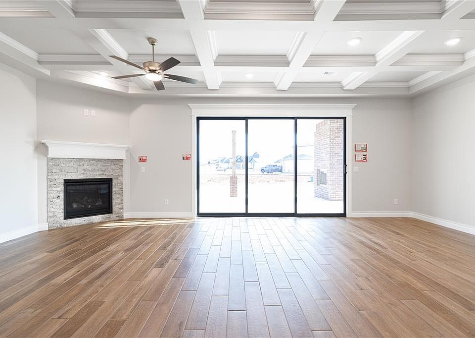 This Mallory Bonus Room floor plan includes 2,955 Sqft of total living space, which features 2,640 Sqft of indoor living space and 315 Sqft of outdoor living space. There is also a 630 Sqft, three-car garage with an in-ground storm shelter installed. This magnificent home offers 4 bedrooms, 3 full baths, covered patios, a utility room, and a large bonus room. The great room presents a beautifully detailed coffered ceiling that extends to the dining room, a gas fireplace with a stacked stone surround detail, wood-look tile, rocker switches throughout, Cat6 wiring, and a luxurious 3-panel sliding door with a 4’ back patio extension. The kitchen has stainless steel appliances, a 5-burner cooktop, decorative tile backsplash, 3 CM countertops, a center straight island with a trash can pullout installed, a large corner pantry, pendant lighting, and custom cabinetry to the ceiling with cabinet hardware installed throughout. The prime suite features a sloped ceiling detail with a ceiling fan, our cozy carpet detail, Cat6 wiring, and windows. The attached prime bath holds a dual sink vanity with framed mirrors, tile flooring, a European style walk-in shower, a free-standing tub, a private water closet, and a walk-in closet. Secondary bedrooms feature high ceilings with a ceiling fan, windows, spacious closets, and carpeted flooring. The covered outdoor living holds a wood-burning fireplace, a gas line, and a TV hookup. Other amenities include healthy home technology, a tankless water heater, R-44 insulation, and so much more!