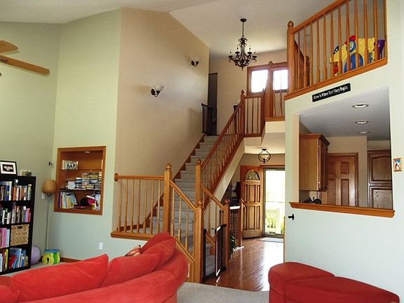 GREAT BUY!!! Adorable home in Prairie Ridge Estates. 3 bedrooms with a private master suite on the first floor. Floor to ceiling stoned faced gas fireplace in dining area is a perfect touch to this home. Kitchen has crown molding, oak cabinets, beautiful hardwood floors and a dinette with bay windows. Whirlpool tub and ceramic tile in bath. Full basement with high ceilings & attached 2 car garage. Seller offering $5000 credit to be used towards closing costs or carpet/paint.
