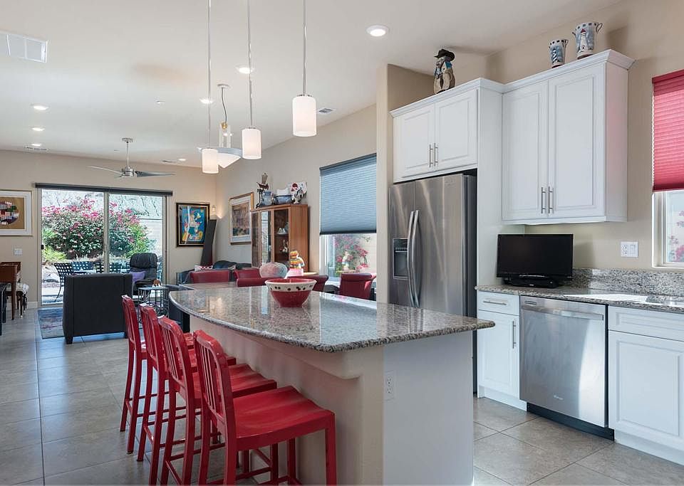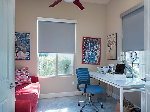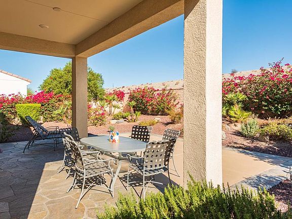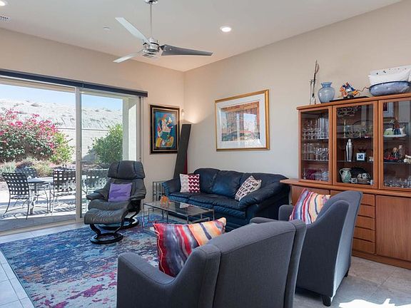 Resort living in an award-winning 55+ community with numerous amenities (included in low dues) and 2 golf courses plus a full-service restaurant and snack bars! This charming 2BR PLUS DEN/OFFICE open floor plan home offers many upgrades including lots of tile, extra lighting, a tankless water heater, expanded patio with flagstone accents and an extra large lot with room for your spa, putting green, extra fruit trees or maybe a pool? This original home owner has taken meticulous care of every system in the house as well as landscaping and it shows. The well-furnished home offers high-end furnishings including George Kovacs tables, designer lamps and Mid-Century Danish bedroom furniture. There's lots of storage in the center island kitchen with pantry closet and in the primary bedroom with large walk-in closet with built-ins. The 2-car garage is oversized. Custom blinds with remotes on some windows. Slab granite kitchen counters. Pendant lights over kitchen island. Designer ceiling fans throughout. You will find sun all day long from the charming front porch to spacious back patio and sublimely desert-scaped back yard. The Santa Rosa clubhouse is nearby and offers a fitness center, pool/spa, basketball, pickleball, tennis, classes, snack bar and check-in for the very popular 18 hole par 3 golf course! Down the street is the SCSH ''Shadows'' full-service restaurant and the pro-shop for the 18 hole par 72 championship golf course. This property is special and not to be missed.