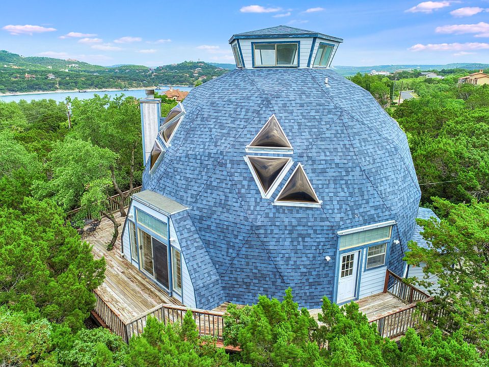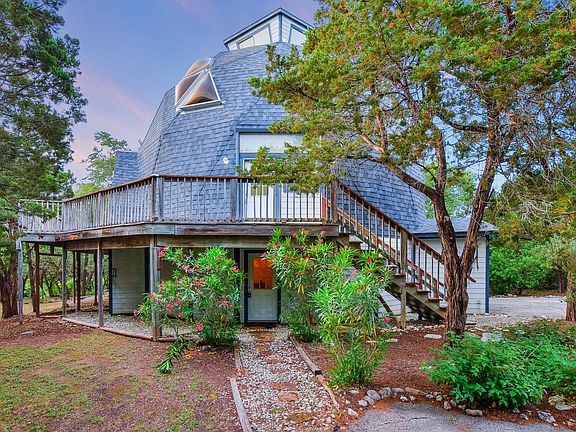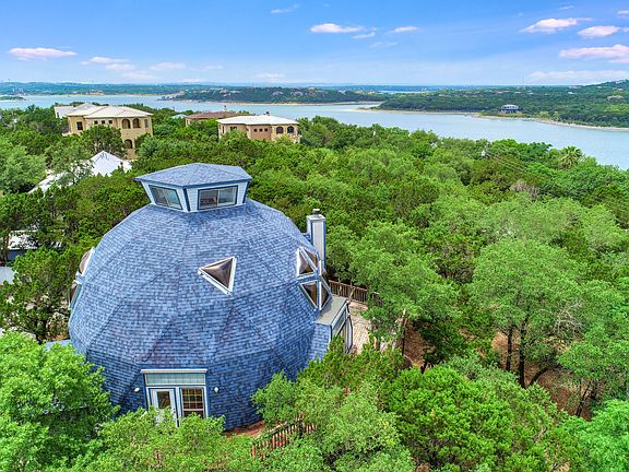 Calling all Hippies! Volente's Epic Dome House is on the market, last sold in 2006. All the incredible windows will blow your mind. Recent roof, elevator shaft, vacuum system & huge wrap around deck. Stroll to the beautiful, large private WF park. Multigenerational floor plan. Total of 4 levels. Lower area is it's own living area w/ stairs to upper floors plus it's own entry. 2nd floor is main living/ kitchen, utility, 2 bedrooms, full bath. 3rd floor is Master BR w/ bath . 4th level is Lookout tower. WOW