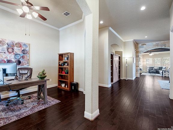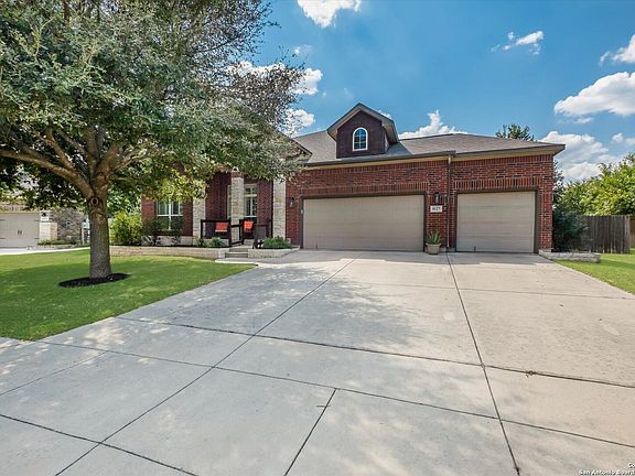 Home Sweet Home! This beautifully upgraded one-story home features 3 spacious bedrooms, 2 full bathrooms, and a rare FOUR-car garage (3-car with tandem) - all located in the highly sought-after Sablechase community within award-winning Boerne ISD! Step inside to an inviting open floor plan with elegant wood and tile flooring throughout. The home includes a dedicated home office, formal dining room, and a breakfast nook, all complemented by a versatile butler's pantry-perfect for your coffee bar setup. The chef's kitchen is a true highlight, boasting granite countertops, gas cooking, stainless steel appliances, and generous cabinet and counter space-all overlooking the warm and welcoming family room with rich wood beam accents and a stunning floor-to-ceiling fireplace. The oversized primary suite offers a serene retreat with dual vanities, a spa-like soaking tub, a walk-in shower, and a spacious walk-in closet. Step outside to the expansive backyard featuring a covered patio with ceiling fans, backing up to a peaceful greenbelt with direct access and scenic views-ideal for outdoor relaxation or entertaining. Major recent upgrades include:New HVAC (2024), New Water Heater (2024), Full Home Water Filtration & Softener System (2024) Rare opportunity to own a well-maintained, move-in ready home in one of the most desirable neighborhoods in the area!