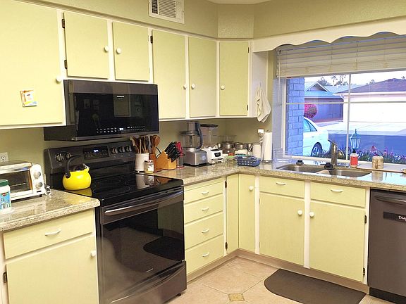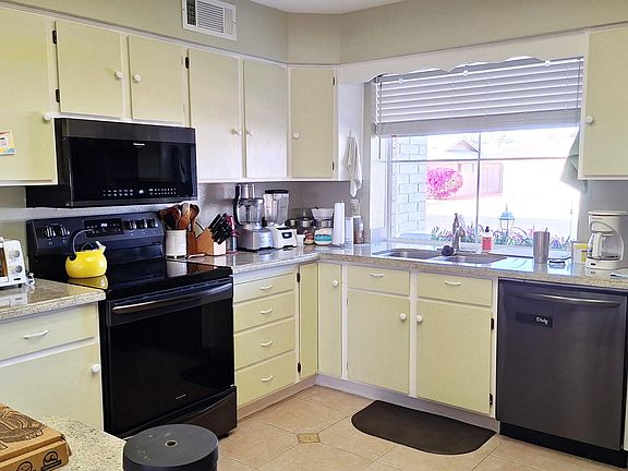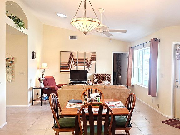 This beautiful home is coming semi-furnished. Through the entry is a large vaulted entry living room and dining room. The kitchen shows lots of cabinets, neutral granite counter tops, upgraded black appliances, designer tile flooring and a pantry. This split bedroom floorplan shows two large bedrooms, and the master has two walk-in closets, and the second bedroom also has a walk-in closet. There is designer tile flooring throughout this home except for the bedrooms that have carpet. There is a separate office and that can be used as a family room or separate sewing room. The South sunny back covered patio is large and there is block privacy wall. Other upgrades include upgraded windows and an upgraded A/C & Heating unit.