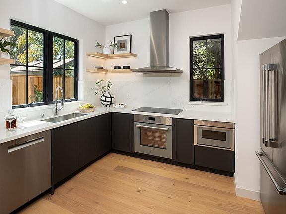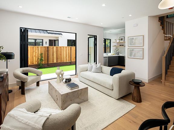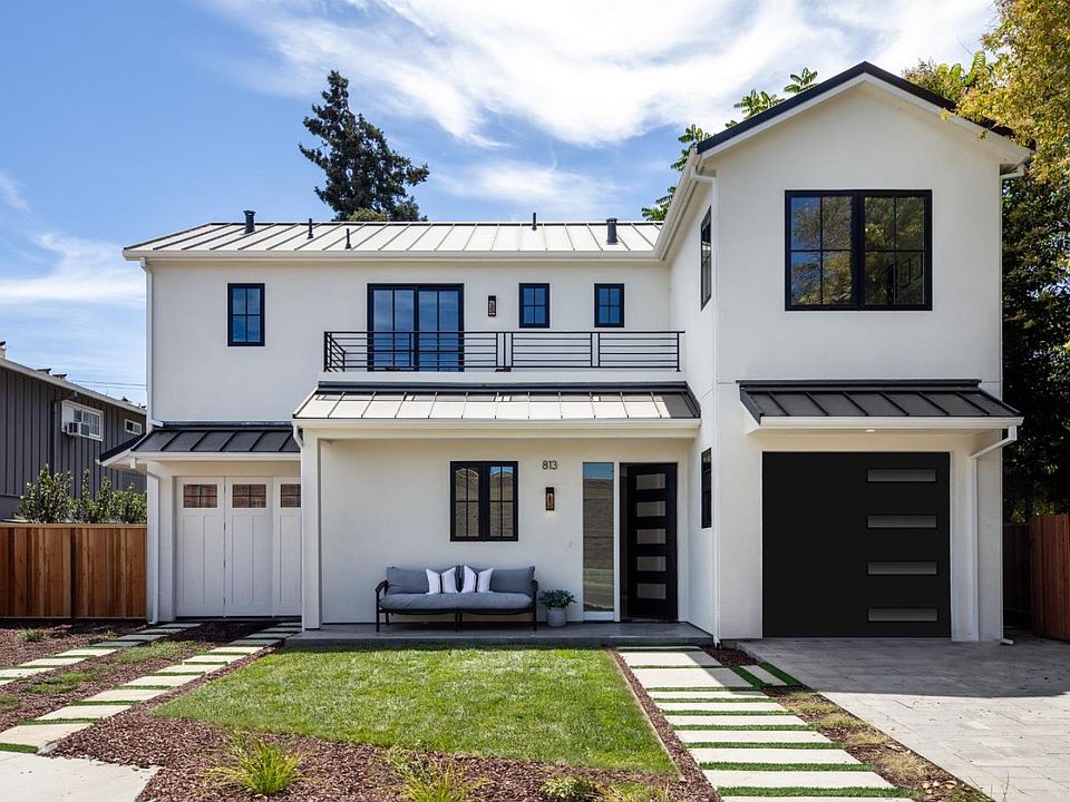 This stunning new construction presents a modern farmhouse design with beautiful finishes in a sought-after Menlo Park location. The two-story floor plan has 4 bedrooms (all 4 bedrooms upstairs) and 3 full baths, stunning hardwood floors, Andersen windows and doors, and abundant natural light. Indoor outdoor living at its best as the living and dining area opens to the rear yard through stacking glass doors. The kitchen features sleek cabinetry, quartz countertops, and premium Thermador and Bosch appliances. The upstairs primary suite has a cathedral ceiling, private balcony, walk-in closet, and luxury bath with freestanding tub and rain shower. Three additional bedrooms share a stylish hallway bath, and a laundry room is also upstairs. Added highlights include attached garage parking for 2 cars, an EV outlet, landscaped yards, Enphase solar energy, and keyless entry. The location is ideal minutes from Meta headquarters, downtown Palo Alto and Menlo Park, and acclaimed Menlo Park schools.