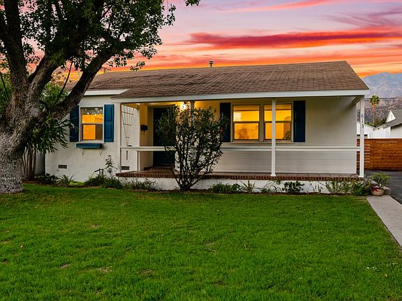 Located on a lovely tree-lined street, this 2 bed, 1 bath character-filled home sits on a 7,000+ SF lot and presents a great opportunity to move into a desirable neighborhood. The covered front porch overlooks the tree-shaded front yard and opens to reveal original 1940s features such as coved ceilings, arched doorways, built-in shelving, and gorgeously refinished original hardwood floors which begin here and continue throughout the home. The living room, with recessed lighting, is great for entertaining & relaxing and the adjacent dining area with chair molding is a great place to share a meal. The kitchen features open faced cabinets, built-ins, & a window overlooking the backyard and is attached to a convenient laundry room. Both bedrooms are spacious and the remodeled full bath features a shower over tub. The backyard has a large open concrete patio, rabbit hutches, a dog run, grassy yard, raised beds for gardening, fruit trees, shed for storage, detached 2-car garage, gated driveway for additional off-street parking and mountain views! Minutes from shopping, restaurants parks, transportation, and The Duarte Recreation Trail, this house is the perfect place to call home for many years to come!