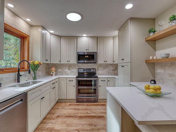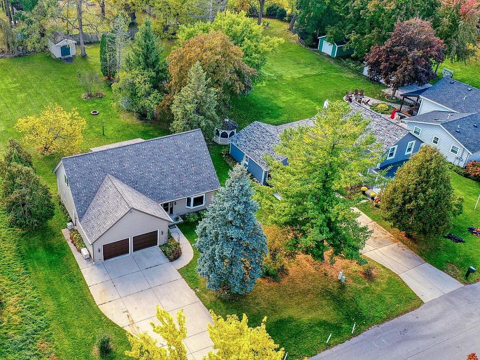 Beautifully modernized 3-bedroom 2.5 bath with large lot on quiet cul-de-sac. Tasteful kitchen with oversized Nantucket bluff cabinets and pantry to maximize space. Bathrooms include custom vanities, quartz countertops, tile shower/surround, and stylish tile floors. New flooring throughout including durable LVP and carpet in bedrooms, staircase, and 4-season room. Large primary with ensuite and access to the calming 4-season room with dry/breakfast bar. Two large upstairs bedrooms with shared bathroom and cute loft area. The 4-season room overlooks a large backyard with patio, fire pit, old growth trees, and a hot tub. Newer roof, sliding doors, and Pella replacement windows with custom screens. All this within walking distance of everything charming Oconomowoc has to offer.