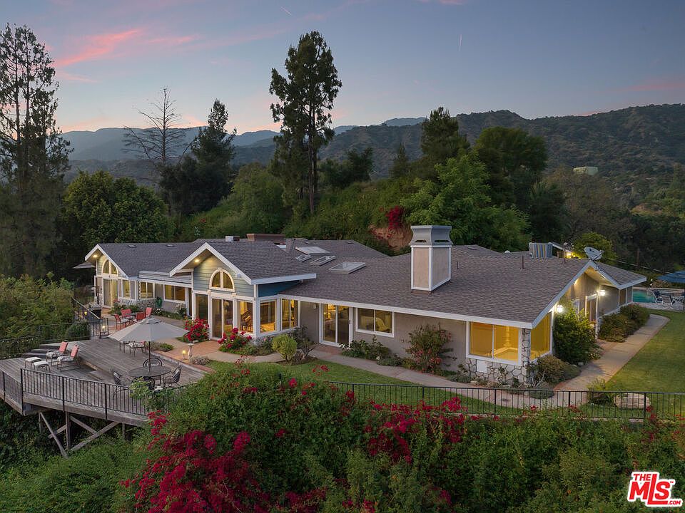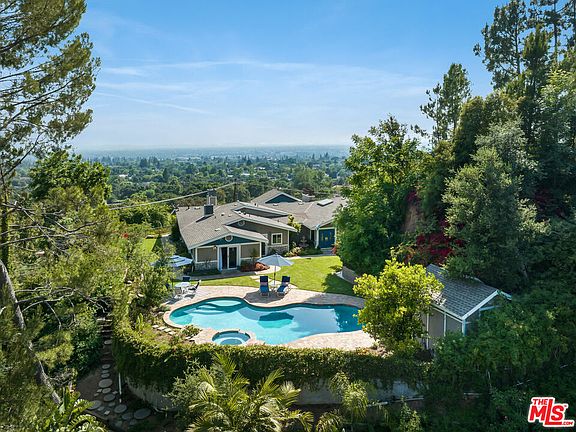 Immersed within lush natural landscape, this enchanting hilltop estate, privately placed on more than an acre of land, presents a serene retreat high above the trees. An extraordinary residence, meticulously crafted to highlight the surrounding panoramic San Gabriel Valley vistas and picturesque mountains. Enter a long private road weaved through robust greenery leading you to your large motor court. A tranquil setting of flourishing gardens guide you to your front door. The foyer introduces multiple sun-drenched living spaces throughout an expansive, functional single-level floor plan. Host family and friends in your intricately designed formal dining room. A seamless flow to the chef's kitchen, complete with granite countertops, a breakfast bar, stainless steel appliances, and clean stone tile accents. Dual living spaces, each with their own fireplace, and an adjacent library, offer elaborate design details, vaulted ceilings, skylights, stained glass accents, and large windows and doors throughout, maximizing the views. A rare one-story layout with 5 bedrooms, all with en-suite bathrooms and spacious closets, including a grand primary suite with its own romantic fireplace and massive tub. A thoughtful, indoor-outdoor flow allows easy access to the open-air grounds, with a wrap-around terrace facing the urban landscape, and a resort-style pool looking out to the hillside scenery, perfect for al fresco dining and entertaining as the sun sets. A unique opportunity to escape the bustling town and enjoy the serenity of the ambient nature, yet close enough to the vibrant Monrovia community, with access to all the charming local shops, restaurants, hiking, and parks, just minutes away from your home. A truly special property on top of the world.