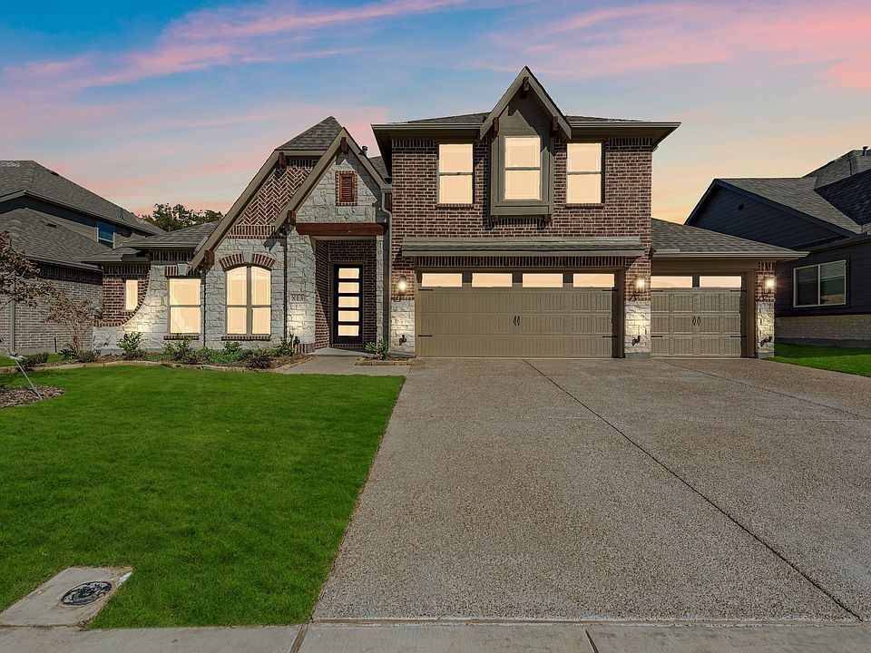 *New Build, Move-In Ready* Stunning two-story with an architecturally pleasing stone and brick exterior, 3-car garage, multiple downstairs bedrooms, and a gourmet kitchen upgraded with quartz countertops. Situated on an oversized, premium homesite backing to a greenbelt - no rear neighbors! Upstairs hosts a huge Game Room with a desk workspace, a Media Room, full bath, and spacious Bedroom 4. This home has more space to entertain friends & family downstairs at the Formal Dining Room, outside on the Covered Patio with a Gas Drop, or in the comfortable open-concept Family Room. Lots of storage throughout with a walk-in pantry, buffet at the Breakfast Nook, large closets, separate laundry, and multiple shelf built-ins. The Primary Suite is a downstairs retreat offering over 300 SF privately located on one side of the home; and a luxury ensuite has upgraded tile, tub, separate shower, and great WIC. Much more to see - Call Bloomfield at Legacy Ranch today!