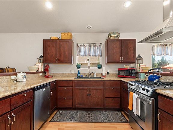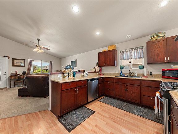 Nestled in the quiet neighborhood of Pinebrook Estates, this single story home offers main floor living ideal for first time buyers or retirees. A newer (2020) gas fireplace, vaulted ceilings, and open floor plan make the living room feel bright and welcoming. The kitchen includes stainless steel appliances, granite countertops, a gas range, an updated (2024) dishwasher, as well as an eating bar that connects to an informal dining area. French doors lead to a fully fenced back yard, perfect for kids or pets. The primary suite features deck access, dual closets, and an en suite bathroom with double sinks and a soaking tub. The insulated garage fits two cars with additional RV parking outside. The energy efficient HVAC was upgraded in 2024. Thrive Broadband high-speed internet is available at the street. Whether you’re looking to sip coffee on the peaceful back deck or enjoy the year-round outdoor activities Chewelah has to offer, this charming home may be perfect for you.