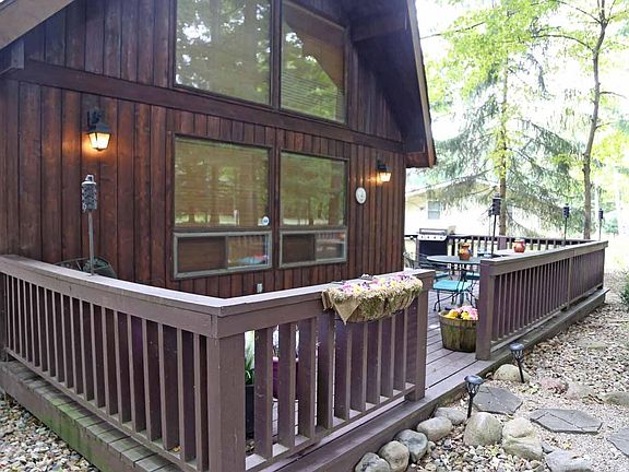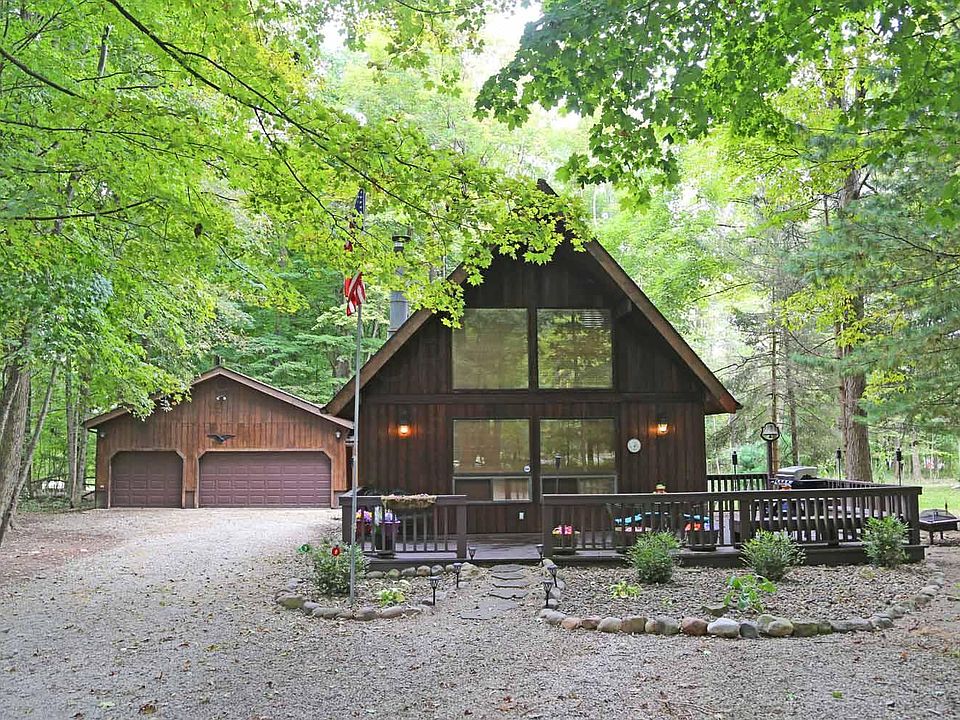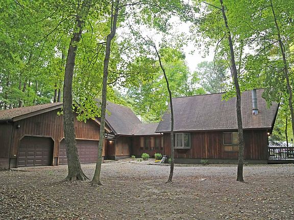 Rustic contemporary home situated on double wooded lots, this home offers 3 bedrooms and 2 full baths, nice sized living room, open kitchen/great room with wood burning stove and vaulted ceilings, adjoining dining area, two large loft style bedrooms, attached 3 car garage, relaxing front decking, perfect for part or full time lake living, priced to sell at $200,000.
